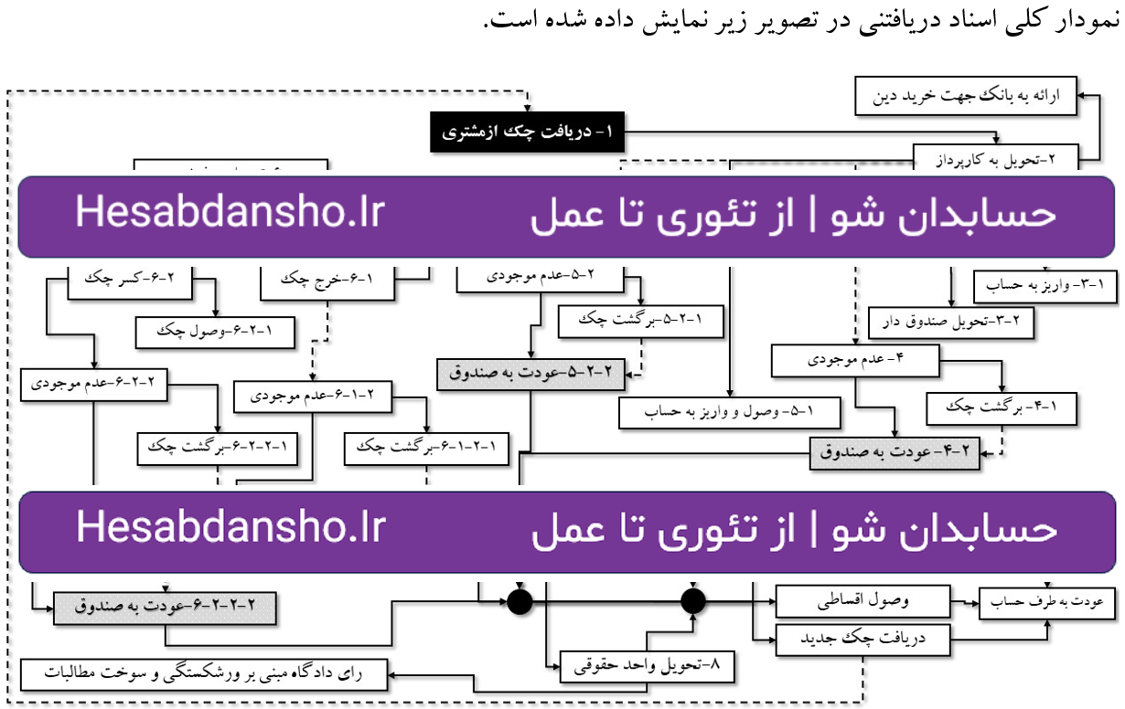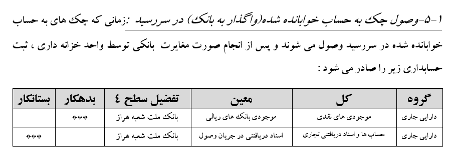 در کتاب عنوان شده مثلا برای "1-5-وصول و واریز به حساب" به شرح زیر سند حسابداری صادر می شود: