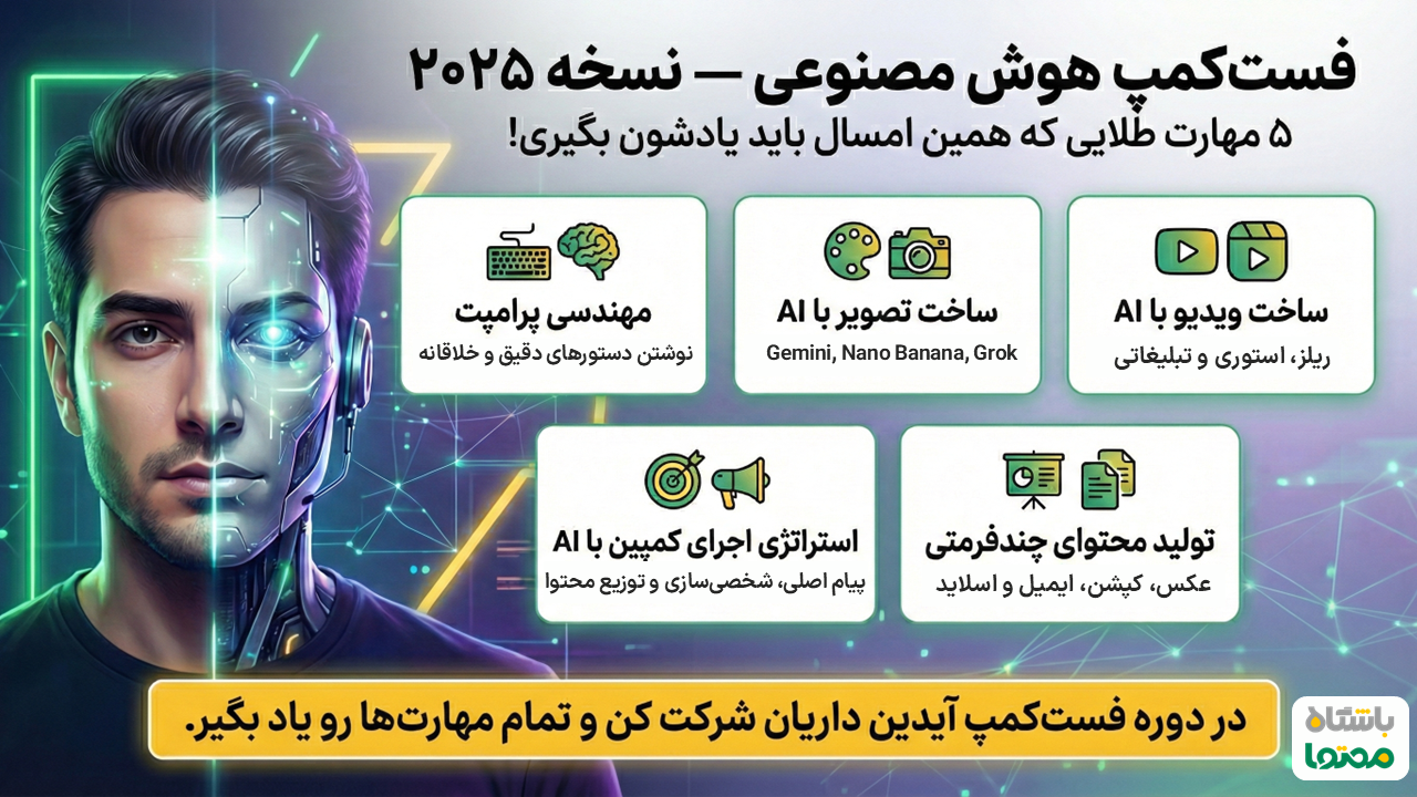 «فستکَمپ تولید محتوا با هوش مصنوعی» یک وبینار تخصصی، کاربردی و کاملاً عملی است که با هدف آموزش سریع و مؤثر مهارتهای تولید محتوا در سال ۲۰۲۵ طراحی شده است. در این دوره دو روزه، شرکتکنندگان یاد میگیرند چگونه با استفاده از ابزارهای هوش مصنوعی، محتوای حرفهای برای اینستاگرام، یوتیوب، وبلاگ و سایر پلتفرمها تولید کنند و کیفیت خروجی خود را چند برابر افزایش دهند.
