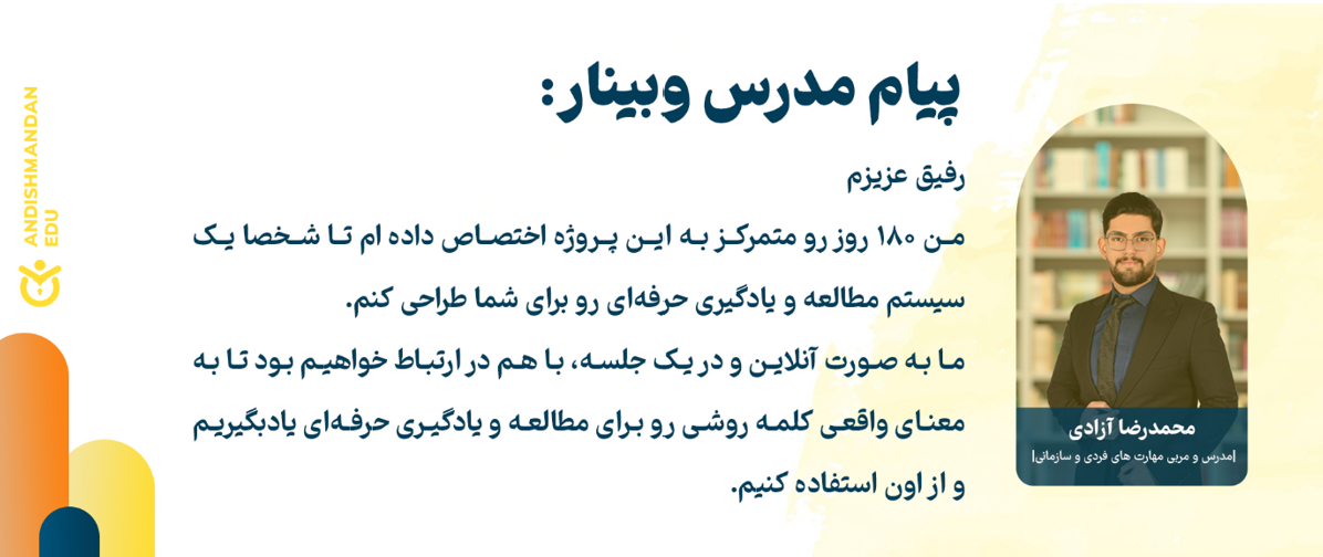 بیش از 3 ماهه که به صورت تخصصی فقط روی این روش متمرکز بودم تا بفهمم، چه فرمولی موفق میشه تا به مطالعه و یادگیری حرفهای برسه اونهم در زمانی خیلی کمتر از روش های معمول، و این فرمول در این وبینار در اختیار شما قرار خواهد گرفت.