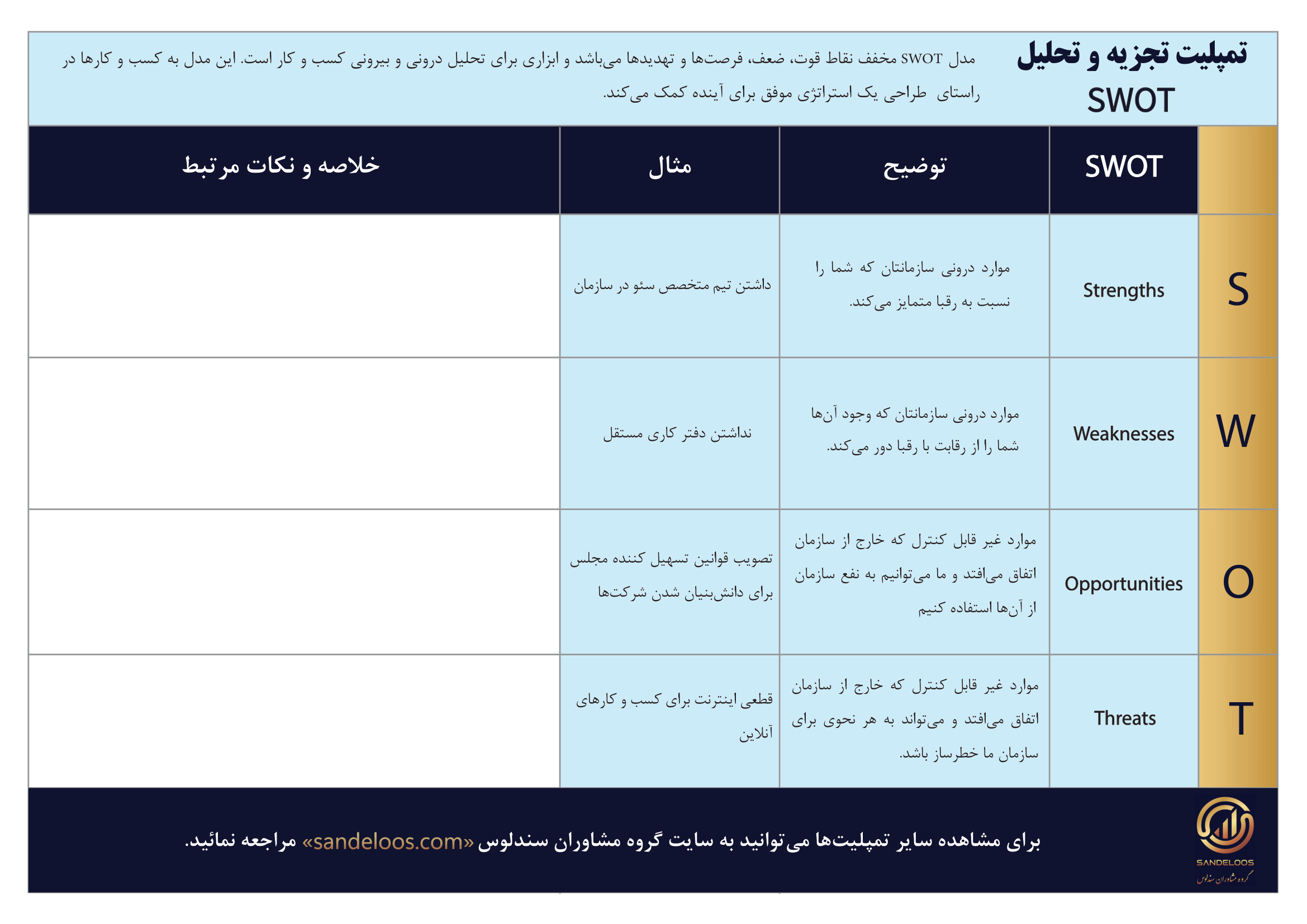 با مدل SWOTنقاط قوت، ضعف، فرصتها و تهدیدهای کسبوکارت رو بررسی میکنیم و با هدفگذاری SMARTمسیر رو شفافتر میکنیم. در ادامه، یه بوم پرسونای کاربردی طراحی میکنی که یه تصویر واضح از مخاطبت بهت میده.