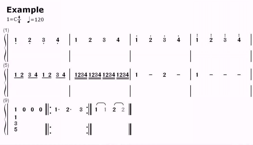 ساختار نوتاسیون: در این سیستم، نتها با اعداد 1 تا 7 نشان داده میشوند که معادل نتهای دو، ر، می، فا، سل، لا و سی در نتهای موسیقی غربی هستند.