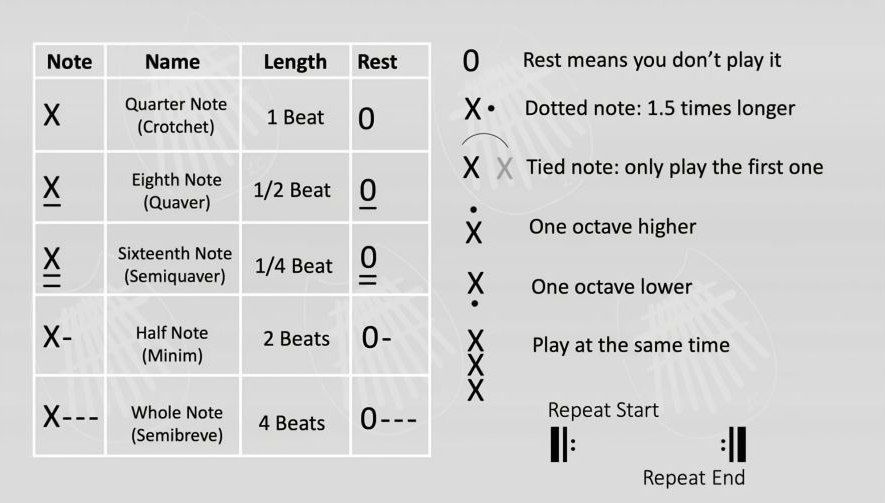 فاصلهها و علائم دیگر مانند نقاط بالا یا پایین، طول نوتها را مشخص میکنند.
