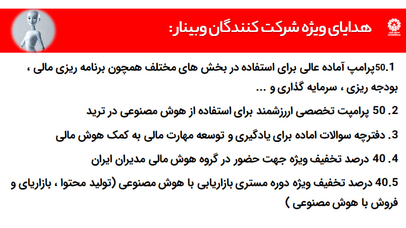 به تمام کسانی که در وبینار حضور دارند کد تخفیف 40 درصدی جهت حضور در گروه هوش مالی مدیران ایران تقدیم خواهد شد .