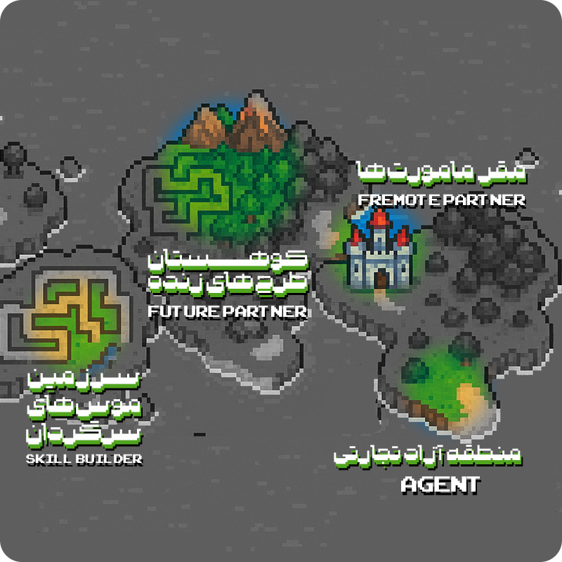 اگر دوست داشتی جلوتر بری، روی نقشه به "منطقه آزاد تجارتی" میرسی! اینجا آموزشهای تکمیلیِ فریلنسری و مارکتینگِ کاتالوگ، بروشور و... هوشمند گرفتی و رسما Agent شدی. میتونی خودت پروژه بگیری و درآمدزایی کنی.