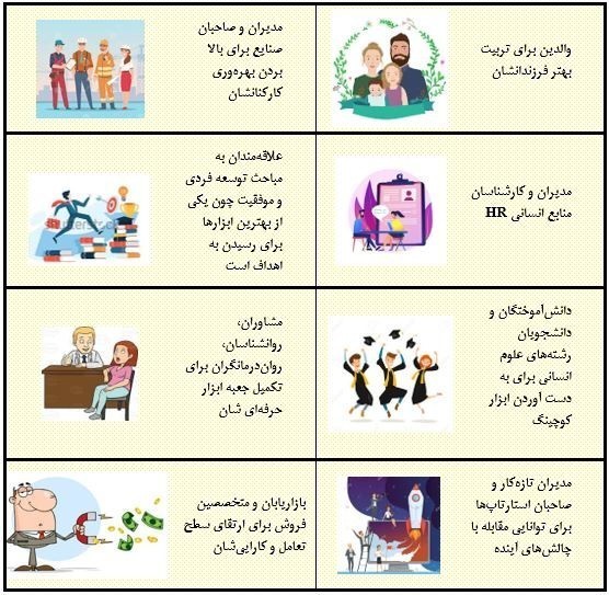 * کارکنان ادارات دولتی برای ارائه خدمت کوچینگ به همکاران و مدیرانشان مانند کارکنان بیمهها، بانکها، شرکت نفت، صنایع فولاد، پتروشیمی و ...