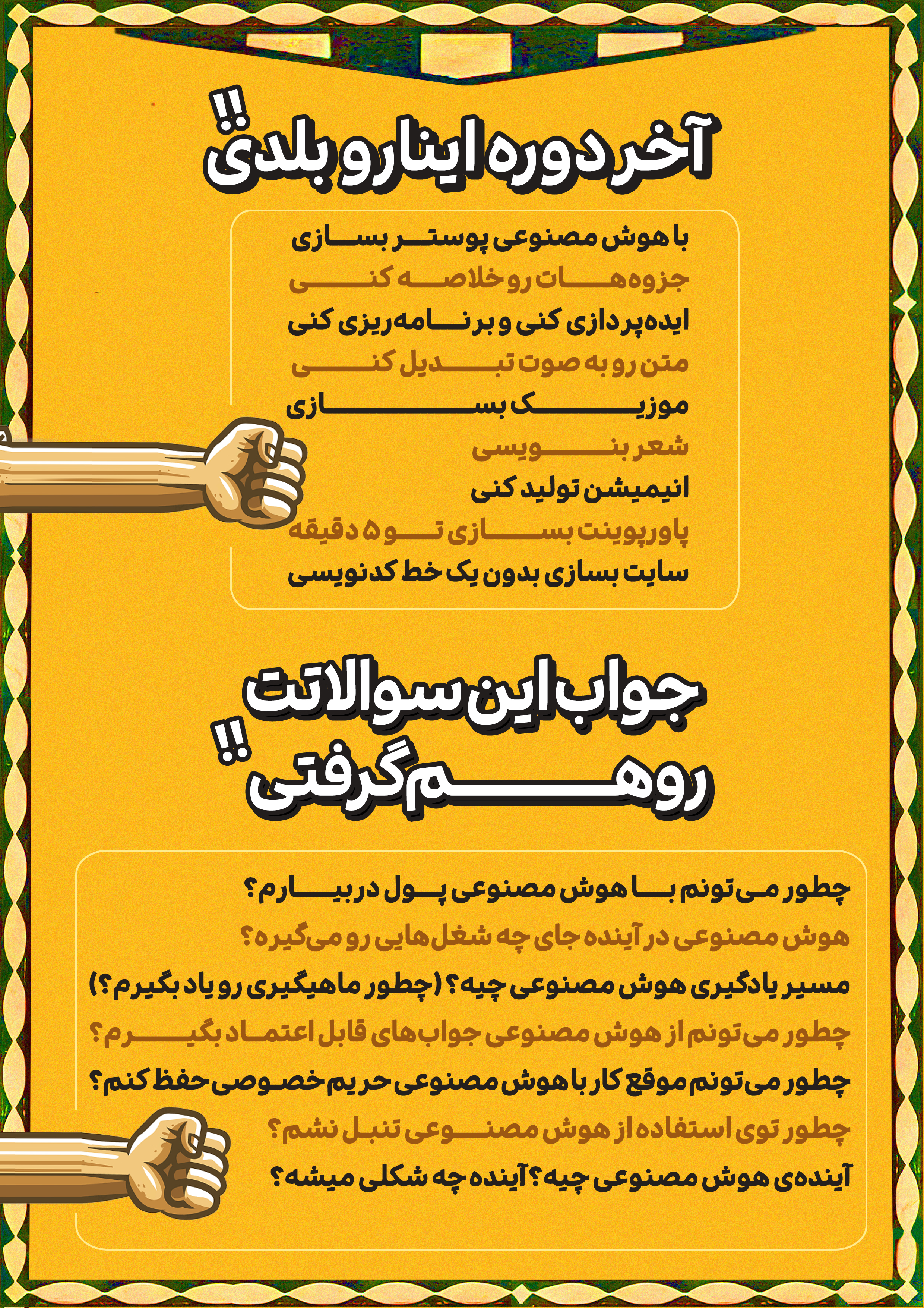 🎉 دوره مهارتی «قوی باش | ماجرای پاییز» یک تجربه ۹۰ دقیقهای پرهیجان برای دختران خلاق و آیندهساز! با هوش مصنوعی یاد بگیر چطور جزوههات رو خلاصه کنی، سایت بسازی، موزیک تولید کنی، انیمیشن بسازی، شعر بنویسی و حتی پول دربیاری! هم حضوری در همدان، هم آنلاین برای کل استان