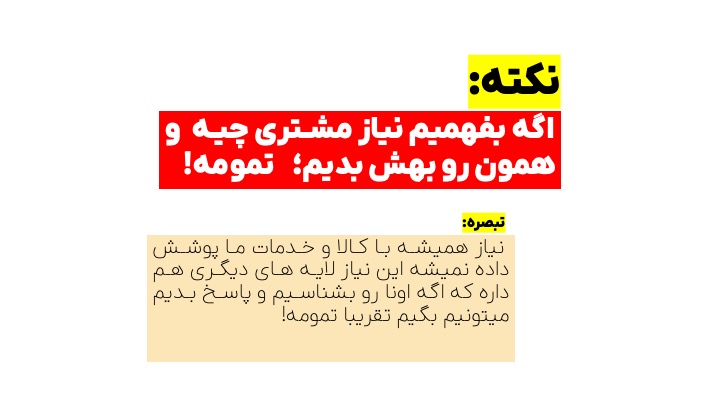ولی نیاز همیشه با کالا و خدمات ما پوشش داده نمیشه این نیاز لایه های دیگری هم داره که اگه اونا رو بشناسیم و پاسخ بدیم میتونیم بگیم تقریبا تمومه!