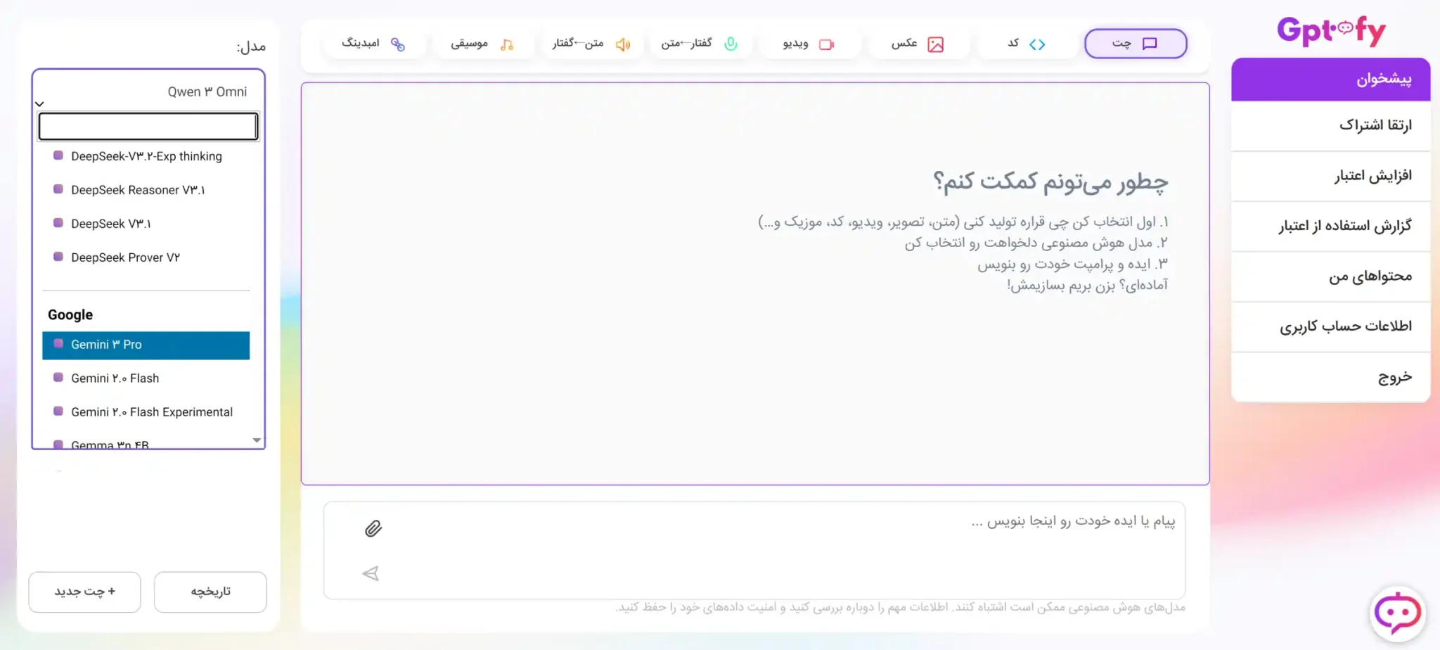 جی پی تی فای، جایی که فقط با یک اکانت، به تمام مدلهای هوش مصنوعی دسترسی دارید. دیگه لازم نیست بین چندین ابزار جابهجا بشید یا برای خرید هر مدل جداگانه هزینه کنید، همهچیز یکجا و بدون دردسر در اختیار شما خواهد بود. با پلتفرم جی پی تی فای تنها با یک اشتراک، میتوانید از ابزارهای برتر هوش مصنوعی مانند GPT-4o، GPT-5.1، Claude 4.5، Nano Banana Pro، Perplexity، Sora 2 Pro، Runway و 300 مدل محبوب دیگر برای پیشبرد پروژههای روزمره خود استفاده کنید. نتایج خروجی تحلیلی و استدلالی فوقالعاده داشته باشید، تصاویر و ویدیوهای باکیفیت و متنوع تولید کنید، حرفهای کدنویسی کنید و تمام ایدههای خلاقانه خود را به سادگی با چند کلیک به کمک مدلهای هوش مصنوعی به اجرا درآورید، آن هم فقط با یک اشتراک در یک پلتفرم. اینجا این امکان رو دارید که سریعتر بنویسید، بهتر تحقیق کنید، راحتتر کدنویسی کنید و در زمان و هزینه صرفهجویی کنید. جیپیتیفای، دستیار هوشمندیه که کار شما رو چند برابر سادهتر میکنه. با جیپیتیفای میتوانید در چند ثانیه، یک مقاله بلاگ حرفهای بنویسید، یک پروژه کدنویسی را کامل کنید، برای تحلیل و تحقیقات پیچیده کمک بگیرید یا حتی برای کسبوکارتان دهها ایده ناب تولید کنید